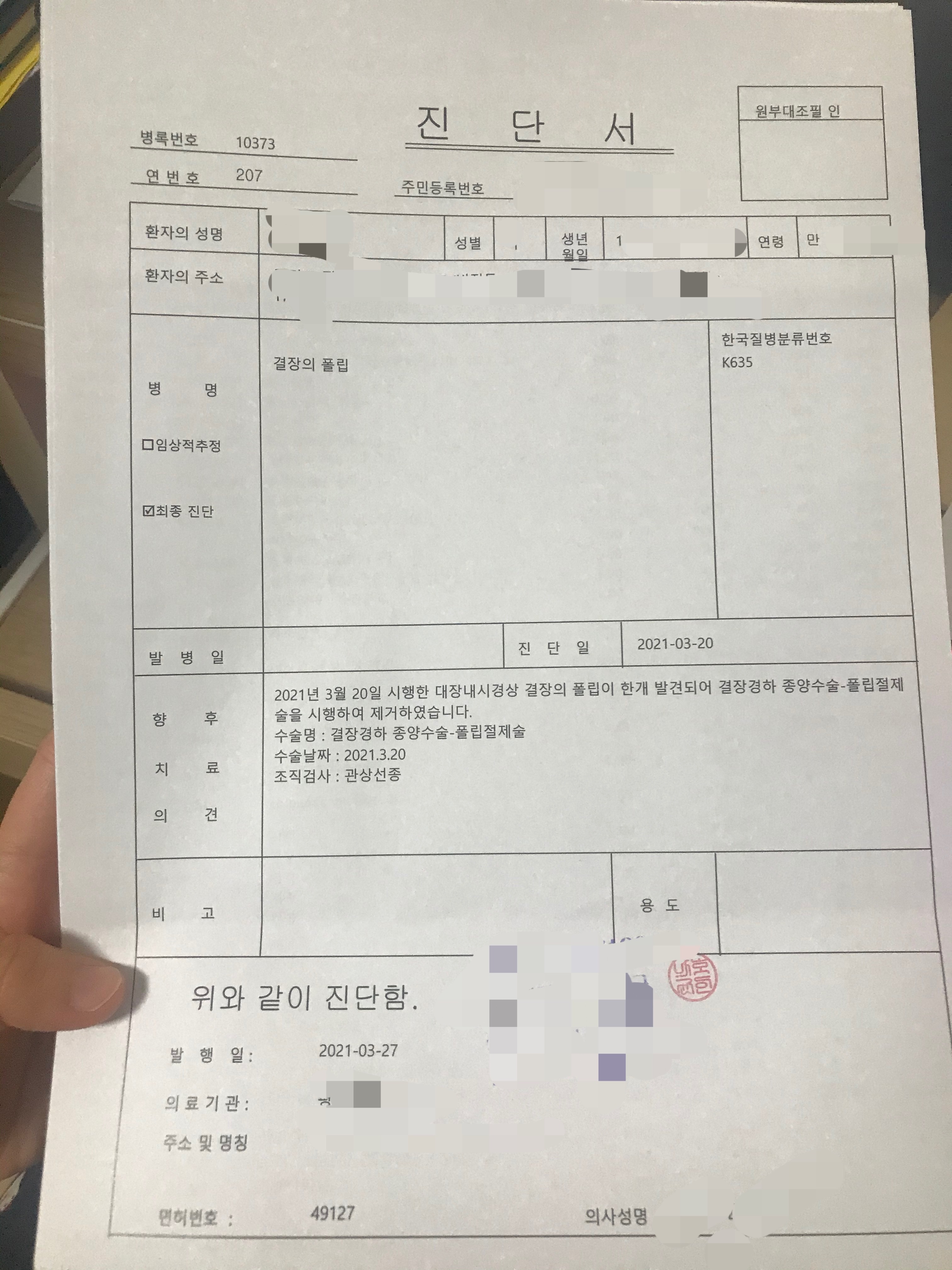 →저 같은 경우는 위 내시경, 대장 내시경 검사 중 위염 증상을 발견해서 위염 치료약을 처방받았고, 대장 내시경 검사 중에는 용종이 발견되어 용종을 제거하였는데 그 용종이 관상 선종이었습니다.(보험금 청구 가능)